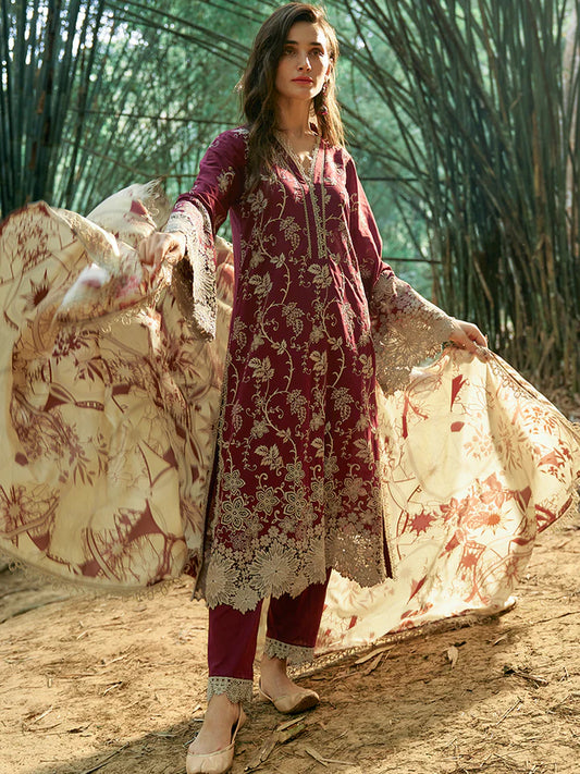 GARNET-3PC LAWN EMBROIDERED SHIRT WITH MONARK PRINT DUPATTA AND TROUSER-UR-2550