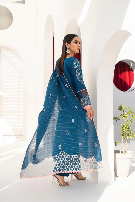 JADE-3PC LAWN EMBROIDERED SHIRT WITH MONARK PRINT DUPATTA & TROUSER-UR-3233