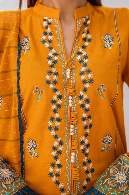 ZAINAB CHOTANI-3PC CHIKENKARI LAWN EMBROIDERED SHIRT WITH MONARK PRINT DUPATTA & TROUSER-UR-2582- MUSTERD