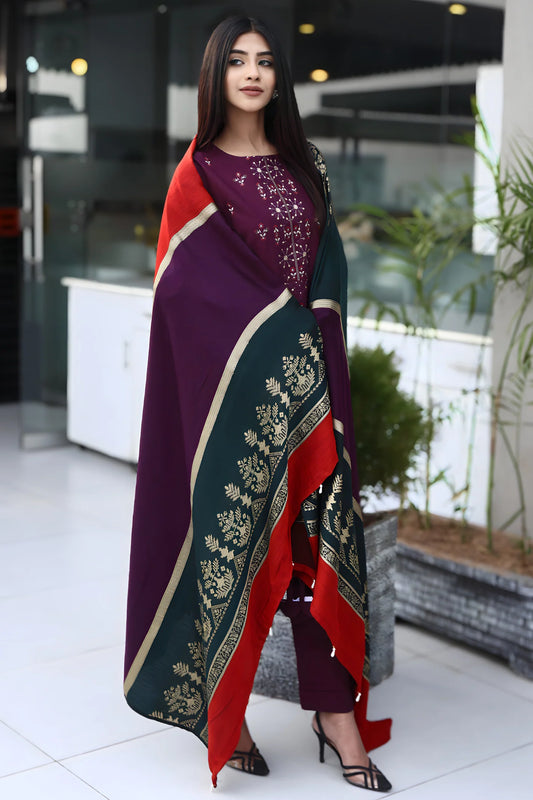 GARNET-3PC DHANAK EMBROIDERED SHIRT WITH DHANAK EMBROIDERED SHAWL & TROUSER-UR-4056