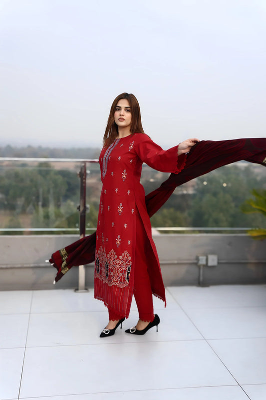 CRIMSON-3PC DHANAK EMBROIDERED SHIRT WITH CHIFFON EMBROIDERED DUPATTA & TROUSER-UR-4086