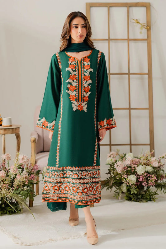 URAN-3PC KHADDAR CUTWORK EMBROIDERED SHIRT WITH KASHMIRI JACQUARD WOOL SHAWL-TBF-GREEN