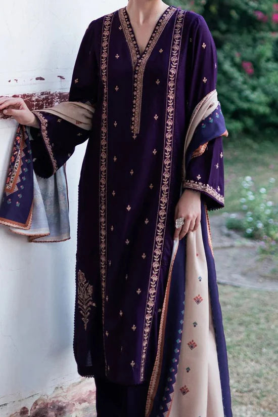 HUSSAIN RAHER-3PC DHANAK EMBROIDERED SHIRT WITH COURTRAI PRINTED SHAWL & TROUSER-